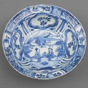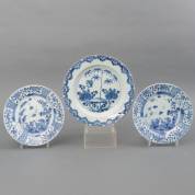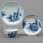 Chinees porseleinen kommetje en twee schoteltjes met blauw-wit decor: huis aan het water, midden 18e eeuw, herkomst: Nanking Cargo -enkele randdefecten-, grootste schoteltje Ø 11,5 cm