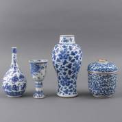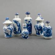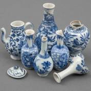 Verzameling Chinees porseleinen miniaturen met blauw-witte decors: zes vaasjes en een dekselkannetje, alle 18e eeuw -alle met defecten-, hoogste 10,5 cm