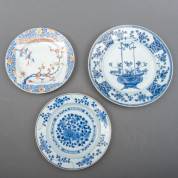 Chinees porseleinen Imari bord met decor van vogel op tak -randchipjes-, Chinees porseleinen dubbelbord met blauw-wit decor van een bloemenmand, Ø 27,5 cm, en een Chinees porseleinen bord met blauw-wit floraal decor -randschilfer-, alle 18e eeuw