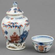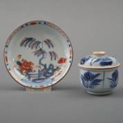 Chinees porseleinen dekselpotje met blauw-wit bloemdecor -chipje van binnenring deksel-, en schoteltje met Imari tuindecor en capucijner onderkant, beide 18e eeuw, 6,5 × Ø 6,5 cm en Ø 12 cm