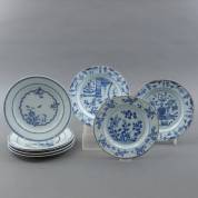 Acht Chinees porseleinen borden met blauw-wit bloem- en tuindecor, waaronder een serie van drie, Qianlong -defecten-, Ø 22,5 cm