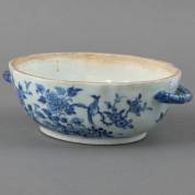 Chinees porseleinen terrine met blauw-wit decor van pauwen in tuin, Qianlong -deksel ontbreekt, één greep gelijmd-, 9 × 28,5 × 18,5 cm