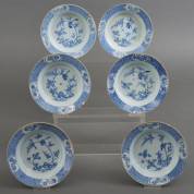 Zes Chinees porseleinen papbordjes met blauw-wit tuin- en vogeldecor, Qianlong -twee met chips, één met haarlijn-, Ø 16,5 cm