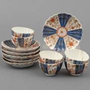 Zes Japans porseleinen Imari geribde kop-en-schotels, 19e eeuw -defecten-, kommetjes 4 × Ø 7 cm