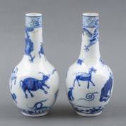 Paar Chinees porseleinen steelvaasjes met blauw-wit dierendecor, Kangxi gemerkt, 19e eeuw -beide halzen gelijmd-, hoogte 20 cm