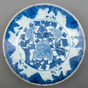 Chinees porseleinen schotel met chrysantendecor in het plat, gemerkt, 20e eeuw, Ø 29,5 cm