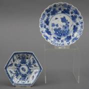 Twee Chinees porseleinen schoteltjes met blauw-witte decors: één met gecontourneerde rand -defecten-, en één octagonaal, beide Kangxi, afmetingen grootste Ø 13 cm