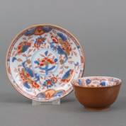 Chinees porseleinen Imari kommetje en schoteltje met floraal decor, 18e eeuw -kommetje met twee barsten en krasjes-, samen 4,7 × Ø 11,5 cm