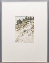 Lau Heijendael (1946), bomen achter zandvlakte, aquarel op papier, r.o. gemonogrammeerd en gedateerd '05, herkomst: Collectie Galerie Jas, Utrecht, 17 × 12 cm