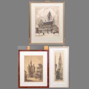 Drie etsen: 'Stadhuis Middelburg' door Laurens Jannis Braams (1913-1998), 34 × 27 cm, 'Sassenpoort Zwolle' door Willem Witjens (1884-1962), 33 × 24 cm, en 'O.L.V. Toren (Klaverblad) door Romain Malfliet (1910-2006), 37 × 11 cm
