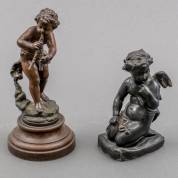 Twee metalen sculpturen: fluitspelende putto en Cupido, 20e eeuw, 16 × 7 × 9 cm