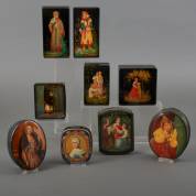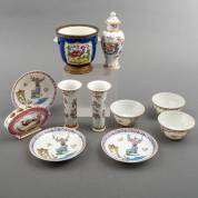 Driedelig porseleinen kaststelletje, uitvoering Samson, Parijs -chip van deksel-, bloemsteker met vogeldecor, cache-pot met bronzen montuur en vogeldecor, 10 × Ø 10,5 cm, en drie Japans porseleinen eierschaalporseleinen kommetjes en schoteltjes