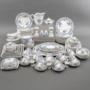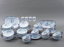 Aardewerk serviesgedeelte met blauw floraal decor: 'Valeria', uitvoering Villeroy & Boch, bestaande uit: 13 dinerborden, 13 diepe borden, negen ontbijtborden, zes soepkommen op losse schotel, grote ovale dienschaal, twee kleinere dienschalen, twee vleeswarenschaaltjes, sauskom op vaste onderschotel, vijf eierdoppen, peper-en-zoutstel, bedekte suikerpot, bedekte mosterdpot, botervloot, twee rechthoekige dienschaaltjes, nest van vijf schalen, zes ronde schaaltjes, zes kleine ronde schaaltjes, melkkan, paar kandelaars, 18 kop-en-schotels, en klein ovaal schaaltje, Ø dinerbord 23,5 cm -gebruikssporen-
