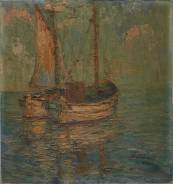 Schilderij: twee boten op het water, olieverf op board, r.o. gesigneerd Nikolaj Triepel -hel, verso met toedracht en gedateerd 1940 -vergeeld-, 33 × 31 cm
