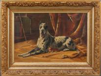 Schilderij: liggende Doberman en slapend katje, olieverf op doek, niet gesigneerd, 20e eeuw -enkele krassen-, 45 × 66 cm