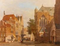 Hollandse School: marktgezicht met kerk, marouflé, r.o. gesigneerd G. Koster, 20e eeuw, 70 × 90 cm