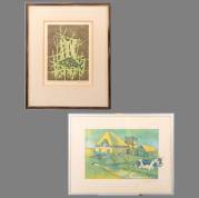 Twee drukken: Richard Gatt (20e eeuw), 'Algues et Poisson', houtblokdruk 24/50, r.o. gesigneerd, en Rob Clous (hedendaags), 'De koe voelt nattigheid', litho 32/60, r.o. gesigneerd en gedateerd '78, grootste werk 32 × 49 cm