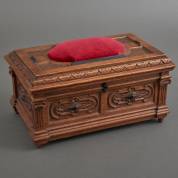 Eiken naaidoos in gotische stijl, het deksel met rood velours speldenkussen, met enkele naai-accessoires, eind 19e eeuw, 16 × 32 × 20 cm