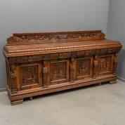 Eiken dressoir met opstaande rand, vier lades en vier deuren, voorzien van gesneden 17e-eeuwse taferelen, circa 1900, 121 × 250 × 53 cm