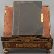 Latoenkoperen lessenaar met steenrode stoffen bekleding en Engelse Bijbel -één los stuk latoenkoper bijgevoegd, gebruikssporen-, 35 × 43 × 32 cm