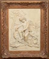 Kunsthars reliëfplaquette met een jachtvoorstelling van een engel rustend bij een gedode leeuw, 20e eeuw, 40 × 29 cm