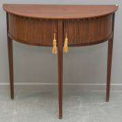 Mahoniegefineerd halvemaantafeltje met twee roffeldeurtjes, Engeland, 19e eeuw -gebruikssporen, één messing bolpootje los maar aanwezig-, 75 × 80,5 × 34 cm