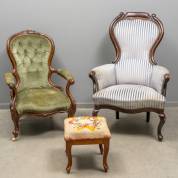 Twee mahonie voltaires, de ene met blauw-wit gestreepte bekleding, de ander met gecapitonneerde groene bekleding -verkleurd-, daarbij: mahonie krukje met gros-point bekleding, staand op cabriolepoten -alle met gebruikssporen-, afmetingen grootste voltaire 117,5 × 80 × 77 cm