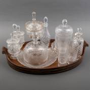 Divers geslepen glas op gekuipt mahonie dienblad -gebruikssporen-