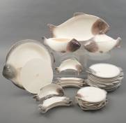 Aardewerk visvormig servies, uitvoering Wächtersbach, bestaande uit: tien grote borden, acht kleine borden, zeven schaaltjes, en vier stuks divers dienservies -één terrinedeksel ontbreekt, diverse defectjes-