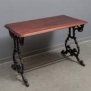 Rechthoekige tafel met mahonie blad op gietijzeren onderstel -blad met gebruikssporen-, 70 × 106 × 61 cm