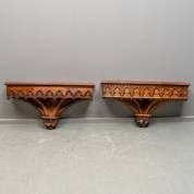 Paar eiken wandconsoles, de randen in gotische stijl, de schuin weglopende steun eindigend in snijwerk met druiventrossen, 20e eeuw, 47 × 89 × 20 cm