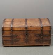 Grote eiken kist met bol deksel, en smeedijzeren banden, stootranden, ornamenten en sloten, 17e/18e eeuw -intensief gebruikt, krimpnaden-, 66 × 131 × 61 cm