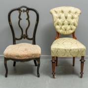 Twee diverse naaistoeltjes: één zwart gelakt met gebloemde bekleding, de ander mahonie met gecapitonneerde bekleding, beide tweede helft 19e eeuw