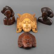 Vier stuks snijwerk: bustes van man en vrouw -mogelijk een paar-, en twee diverse muurmaskers, alle Bali, eind 20e eeuw, grootste masker 29 cm hoog