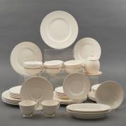 Crémewit porseleinen serviesgedeelte, uitvoering Spode, Copeland, bestaande uit: zes dinerborden, vijf ontbijtborden, zes fruitborden en één taartbordjes, zes soepkommen met schotels, vijf ronde schaaltjes, twee ovale opdienschaaltjes en één dekselpotje -gebruikssporen-