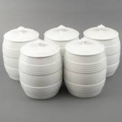Vijf porseleinen bedekte voorraadpotten, één met randchipje, hoogte circa 27 cm