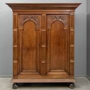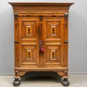 Eiken tweedeurs kast met gezwarte en notenhoutengefineerde accenten, Hollands, 17e eeuw -enkele fineerschades, sleutelplaat ontbreekt, defecten aan opengewerkte ornamenten tussen poten aan zijkant maar grotendeels wel aanwezig-, 190 × 150 × 64 cm