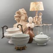 Divers kleingoed: twee windlichten, steengoed kruik, porseleinen dekselschaal, beeldlamp: jager met gezin, biscuit buste van Mozart, twee Japans porseleinen diepe schalen, siervaas met metalen oren, en buste van jonge vrouw, hoogte buste 71 cm