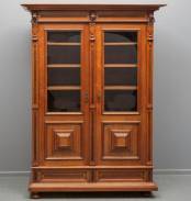 Eiken boekenkast met beglaasde deuren en gesneden leeuwenkoppen onder de kap, 20e eeuw, 200 × 145 × 50 cm