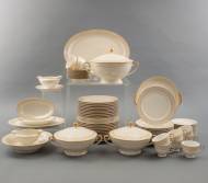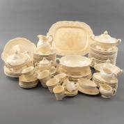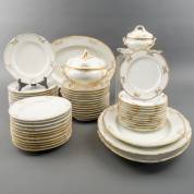 Porseleinen serviesgedeelte met vergulde bladmotieven op de rand, niet gemerkt, bestaande uit: 24 dinerborden Ø 24 cm, twaalf diepe borden Ø 24 cm, twaalf dessertborden Ø 21 cm, terrine, sauskom en vier grote ovale dienschalen -vergulding vaak sleets-