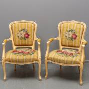 Paar witgelakte armstoelen met gros-point bekleding, Louis Quinze-stijl, 20e eeuw, zithoogte circa 40 cm