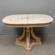 Crèmewitgelakte ovale schuiftafel op vierspantpoot, eind 19e/begin 20e eeuw -zeer sleets, met tussenblad van later datum-, 81 × 135 × 95 cm