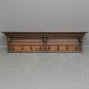 Eiken wandkapstok met drie gesneden kopjes, Hollands, neorenaissance, 37 × 154 × 22,5 cm