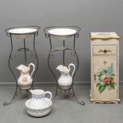Twee aardewerk waskommen en -kannen in metalen standaard, witgeschilderd kastje met bloemdecor, en aardewerk lampetstel, modern, kastje 80 × 34 × 30 cm