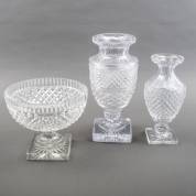Drie stuks glas met ruitslijpsel: twee vazen en een coupe, 20e eeuw -krasjes, chipjes-, hoogste vaas 33 cm, coupe 20 × Ø 24 cm