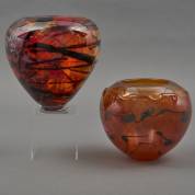 Twee bruinrode glazen vazen met vrij strependecor, beide modern, één gesigneerd 'Verrerie d'art JP Mateus', voor Jorge Mateus, de ander ongesigneerd -ongesigneerde vaas met gelijmde breuk in voet-, 21 × Ø 21 cm