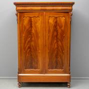 Mahonie linnenkast met achter de deuren drie planken en twee lades, tevens lade in de onderste plint, biedermeier -plank los, lichte gebruikssporen-, 185 × 118 × 44 cm