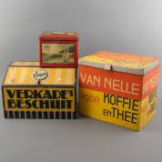 Drie voorraadblikken: Van Nelle, Verkade en King pepermunt, 20e eeuw -oxidatie, slijtage, gebruikssporen-, 37 × 28,5 × 41,5 cm