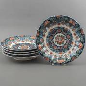 Vijf aardewerk wandschotels met plooirand en polychroom bloemdecor, uitvoering Tichelaar, Makkum, Ø 39 cm