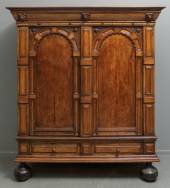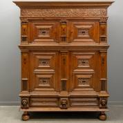 Eiken vierdeurs kast met rechte kap, de fries met gesneden fruitmand en acanthusbladeren, de deuren voorzien van gesneden paneeltjes, geflankeerd door gecanneleerde zuilvormige stijlen, daaronder een lade met drie leeuwenmascarons en bolvormige poten, Hollands, renaissance, 196 × 162 × 66 cm